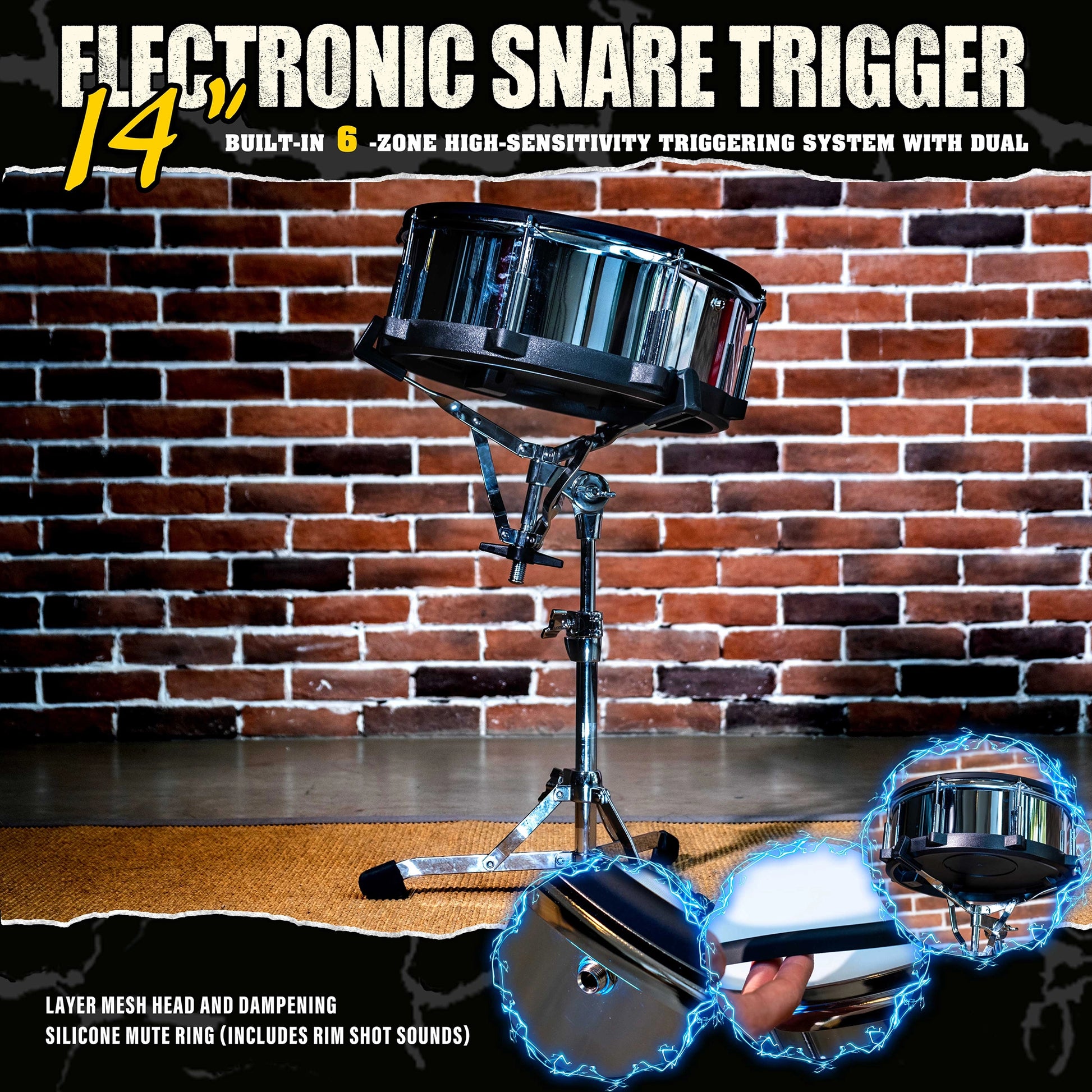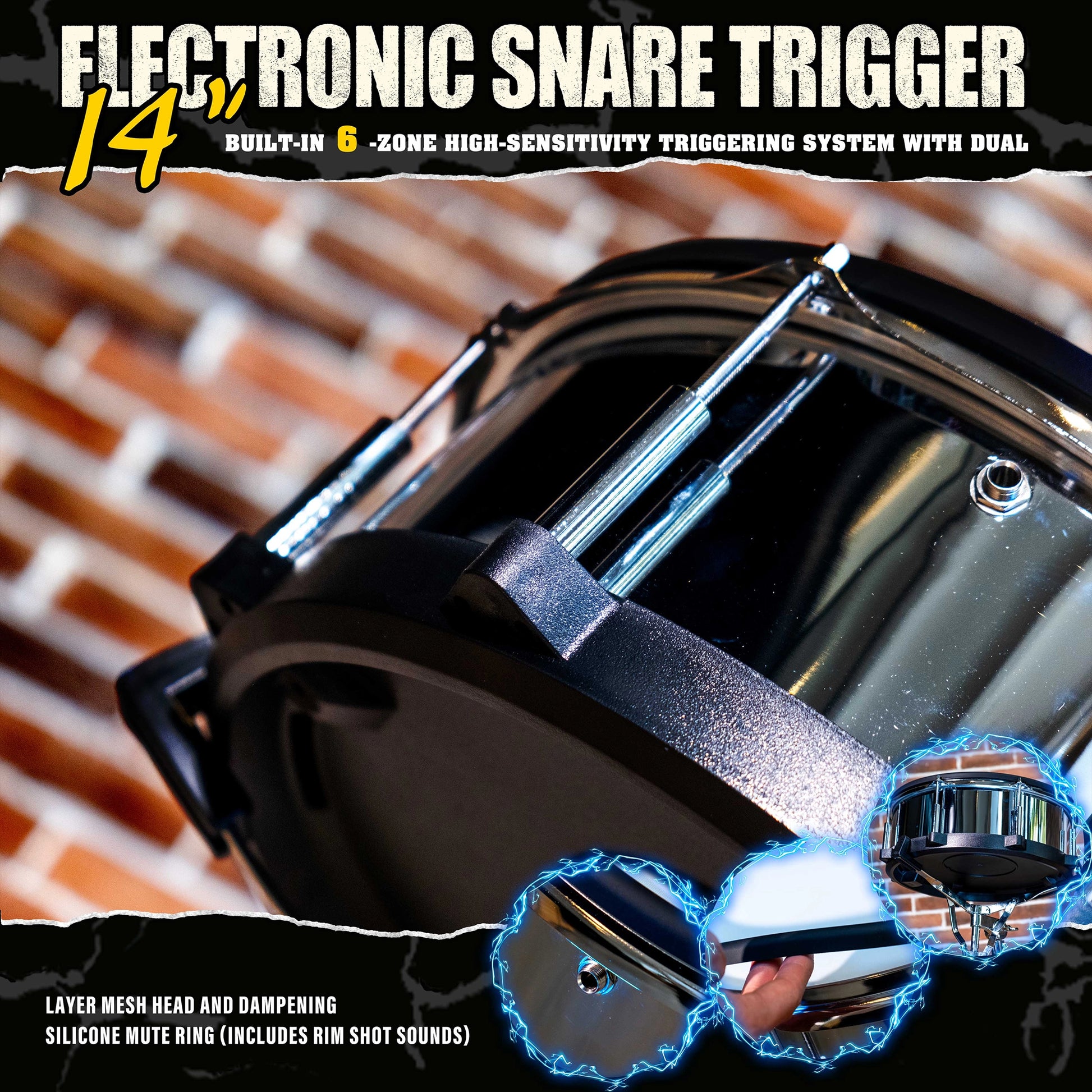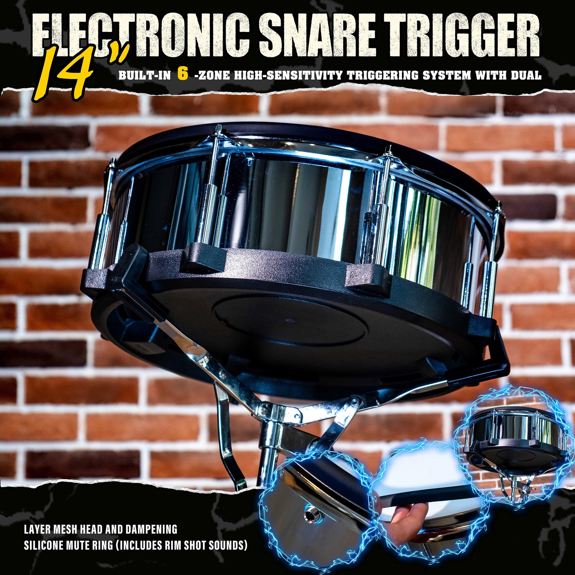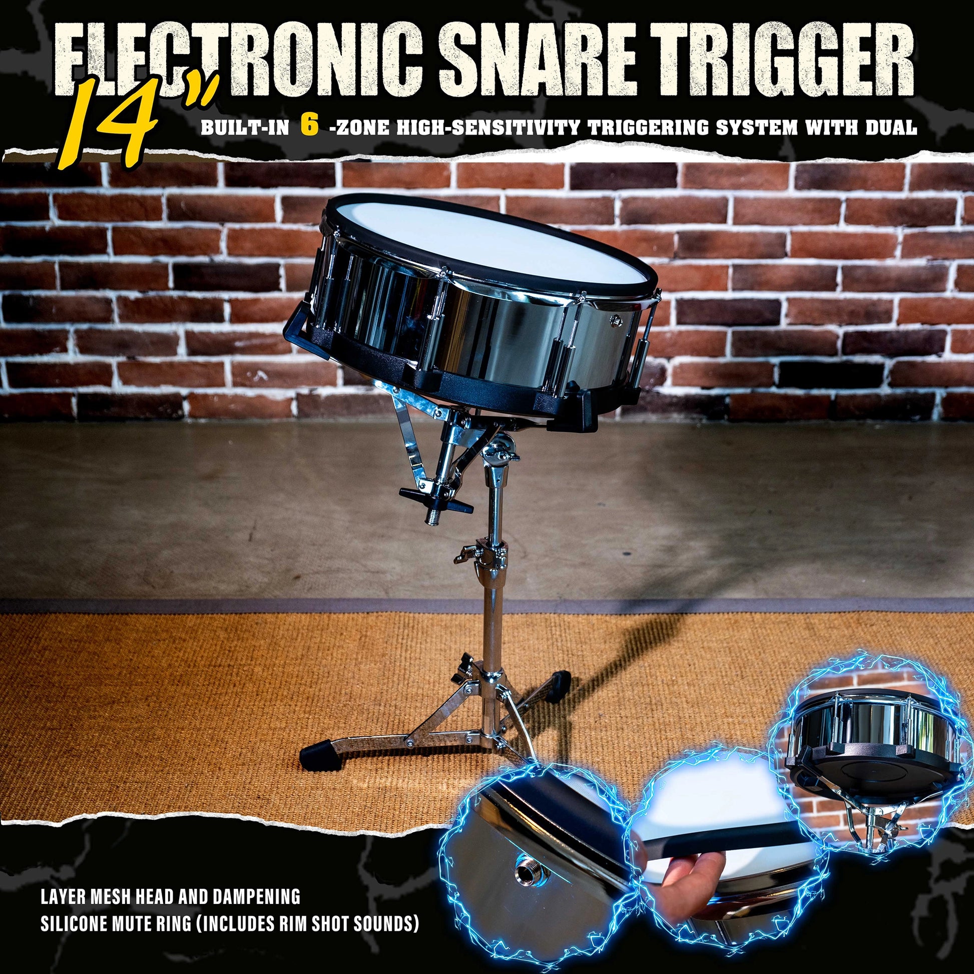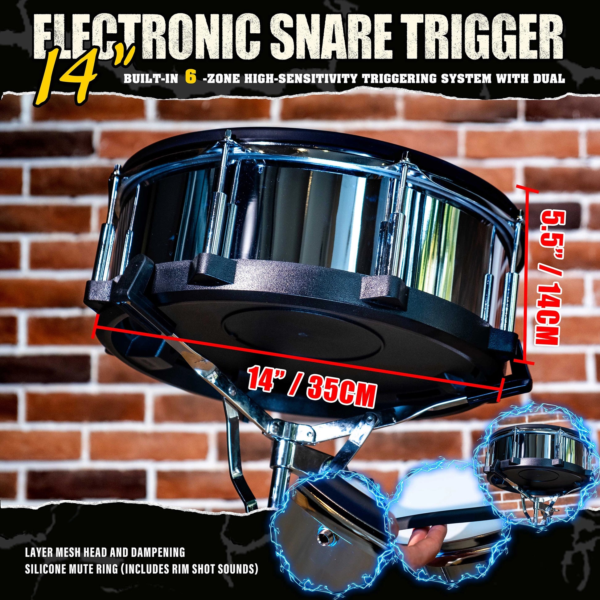 Authentic 14-Inch Size: The full-size 14" diameter provides the familiar ergonomics and presence of an acoustic snare, allowing for a seamless transition between acoustic and electronic kits without altering your playing posture.Realistic Feel & Rebound: Features a durable double-layer mesh head that mimics the tension and bounce of a traditional mylar skin. It is fully tension-adjustable to match your preferred stick response.